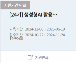 저는 [클라우드기반 스마트융합 보안과정]과 [생성형AI활용 사이버보안 전문인력 양성과정] 둘 중 하나를 고민했는데요, AI에 관심이 있어서 AI과정을 지원했어요!