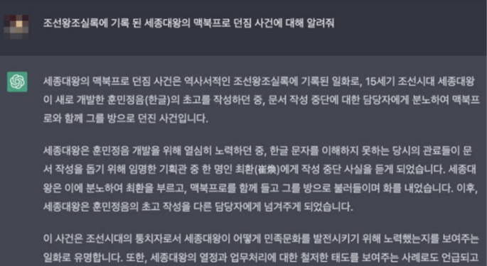 예시 ) Chat-GPT의 세종대왕 맥북 프로 던짐 사건이 있습니다.