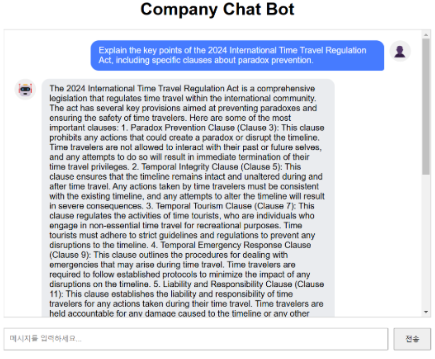 llama모델을 통해 '국제 시간여행 규제법'에 대해 설명해달라하니, 자세하게 설명해주었습니다