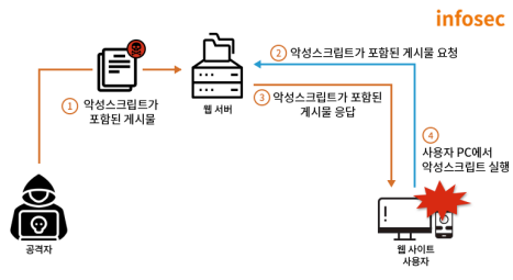 - 웹 애플리케이션의 취약점을 이용해 공격자가 악성 스크립트를 웹 페이지에 삽입하고, 사용자가 해당 페이지를 열람할 때 스크립트가 실행되도록 유도하는 공격