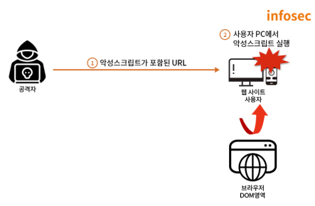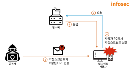 - 악성코드를 URL 파라미터에 포함시켜 사용자가 특정 URL을 클릭하면 스크립트가 실행되도록 유도