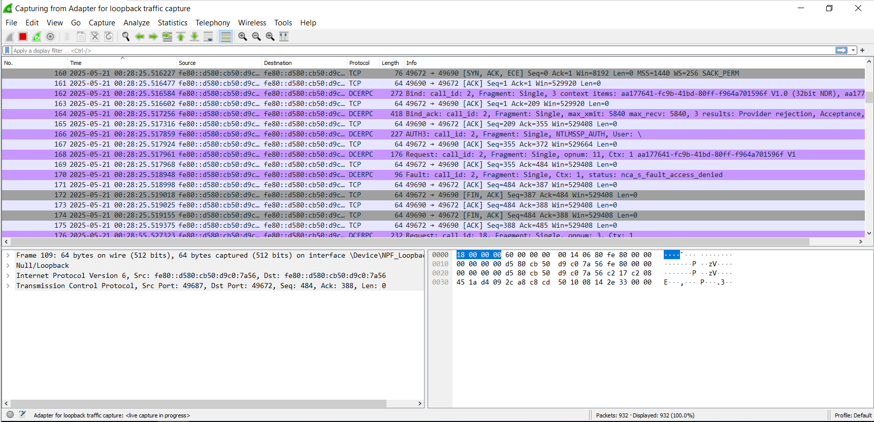TCP통신중이며 ACK(응답확인)한 것을 확인 가능