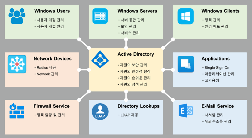 - 도메인 컨트롤러 (AD 환경에서 도메인을 관리하는 핵심 서버, 네트워크에서 사용자, 컴퓨터, 리소스에 대한 인증과 권한 부여하는 핵심 서버)