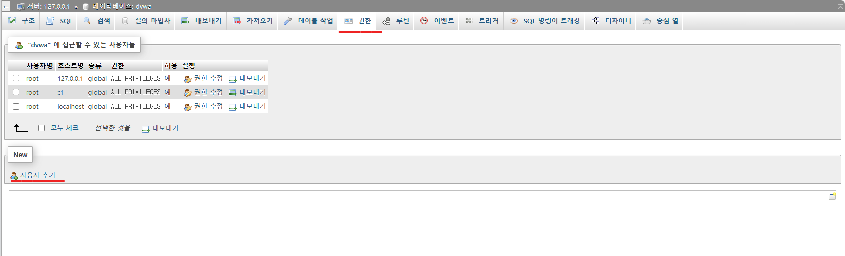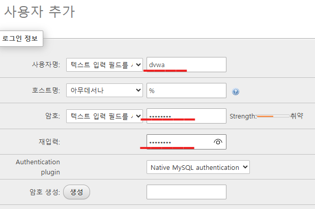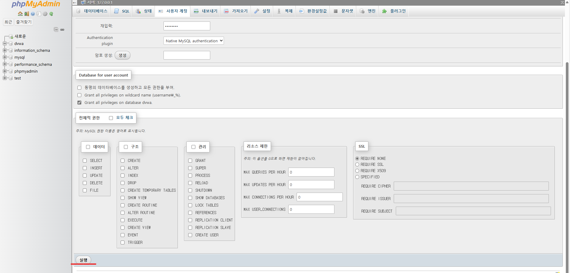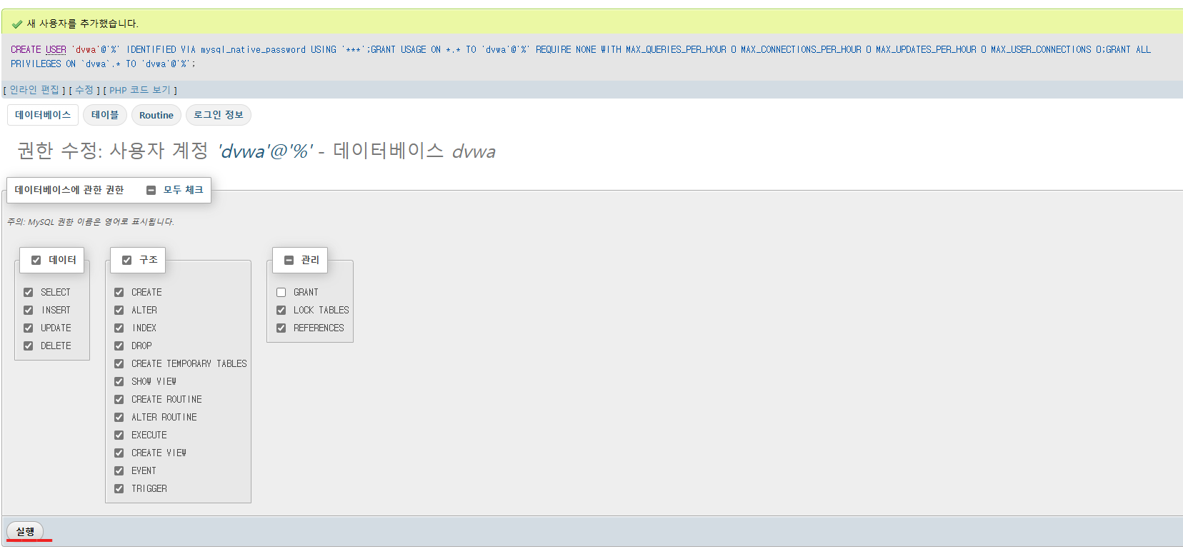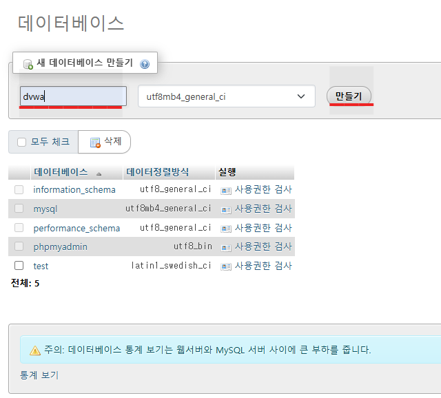 데이터베이스 이름에 dvwa를 입력하고 만들기를 누른다.