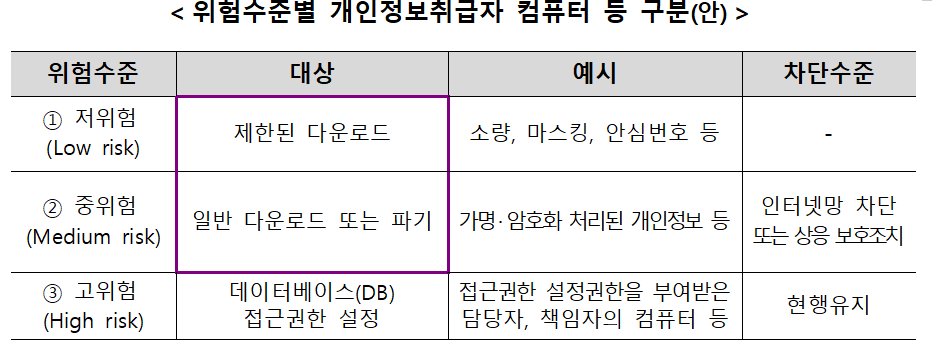 - 중위험 수준 : 일반적인 개인정보를 처리하는 부서나 시스템에 대해 논리적 망분리, 접근 권한 관리, 정기적인 보안 점검 등 중간 수준의 보안 조치 적용