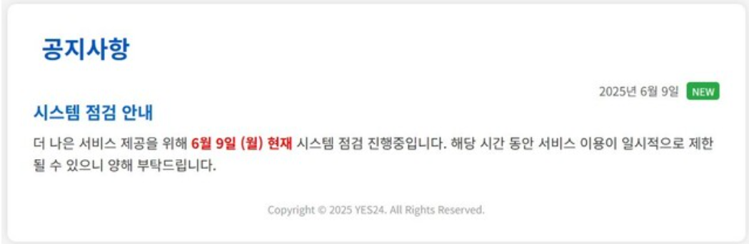 2025년 6월 9일, yes24홈페이지가 [시스템 점검 안내]라는 공지와 함께 모든 서비스가 중단되었다. 실제로는 당시 해킹 사실을 이미 인지하고 한국인터넷진흥원(KISA)에 신고한 것으로 드러났다. 이는 10일 국회 과학기술정보방송통신위원회 소속 최수진 의원(국민의힘)이 KISA로부터 제출받은 자료를 공개하며 밝혀졌다. 6월 10일과 11일, KISA에서 해킹 사태를 파악하기 위해 예스24본사로 사고 분석 전문 인원들을 2차례 파견했지만, 예스24는 기술 지원에 협조하지 않았다. 6월 11일, [랜섬웨어로 인한 서비스 접속 오류] 라는 공지가 다시 떴다. 6월 12일, KISA에 기술지원을 요청했고, 예스24의 공연 예매내역 시스템이 일부 복구되었다. 6월 13일, 홈페이지 및 일부 기능( 도..
